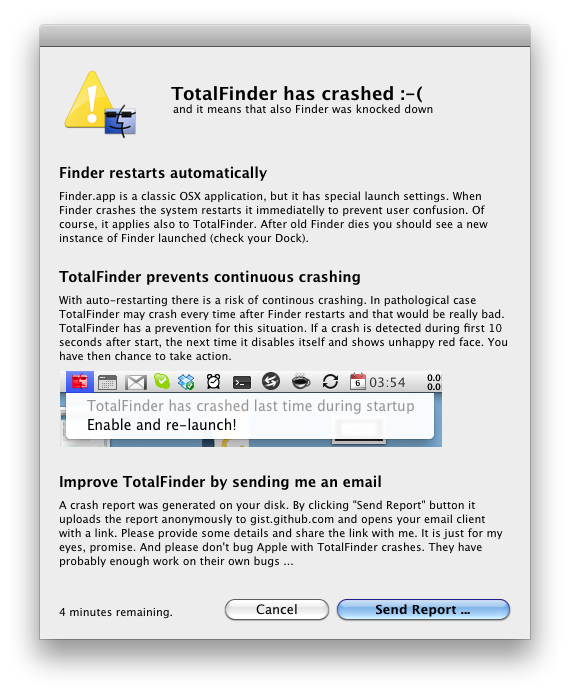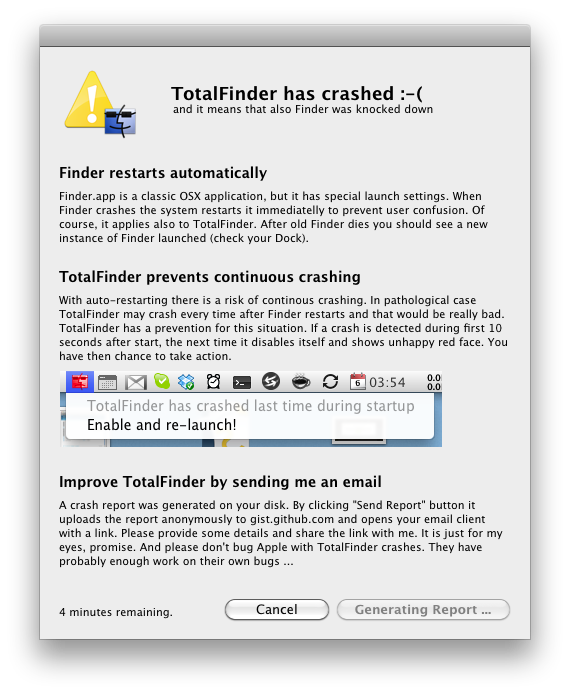 When TotalFinder crashes the user a gets custom dialog with explanations: