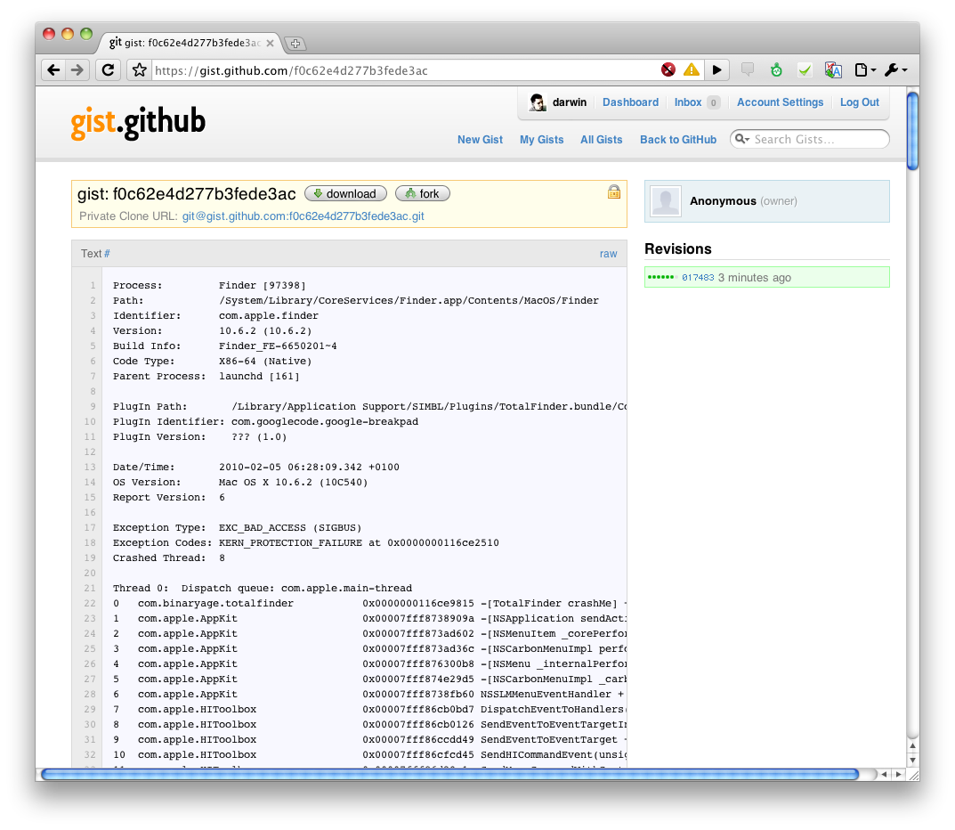 Ok, now I forced crash report file to be silently generated somewhere on the disk. The last step was just waiting for it to get generated and finding it. At this point I enable “Send Report …” button. When user clicks it, I grab the file and upload it to gist.github.com. Again I’m so uncool for reinventing the wheel so I use Chris Wanstrath’s gist.rb uploader. Jaaaaay it’s Ruby code! Much better than hanging myself trying to do a HTTP call using Cocoa.