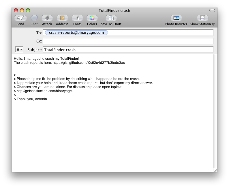 This is no rocket social engineering surgery. This is just a system I would like to use as a user. There is a pretty good chance the user is able and willing to send an email. There is also explanatory text which looks like a message they are replying to with personal note that all crashes are being read by the author and not some black hole. But what’s more: It is completely transparent! They probably trust their email client more than some spinning TCP/IP wheel of some custom reporting dialog. All information is pure text so they can check it before sending. I didn’t want to use attachments, but thanks to gist the mail is not bloated and scary.