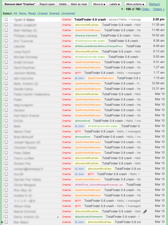 This is a list of crashes I got during the last 48 hours. I’m happy to announce I have just squashed [@askForNewFileBrowser], [@NumberOfDualTabs] and [@TabStripController dealloc].